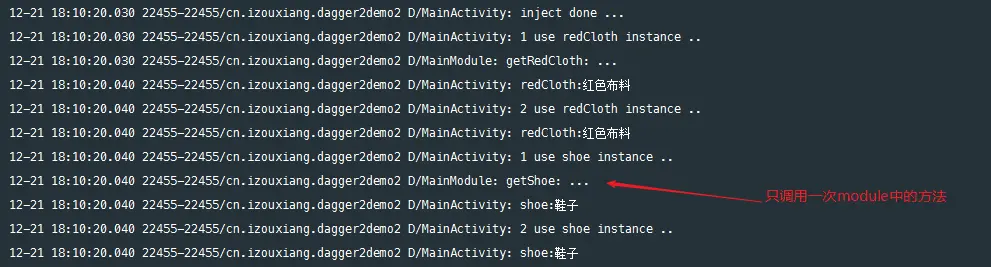 发现,声明单例后,使用shoe时也不会每次都去调用module中的方法了,这是因为Provider的作用是每次使用时都对依赖对象重新注入,但是Shoe在Component中是单例的,所以每次注入的都是同一个实例,所以只会调用一次module中的方法.