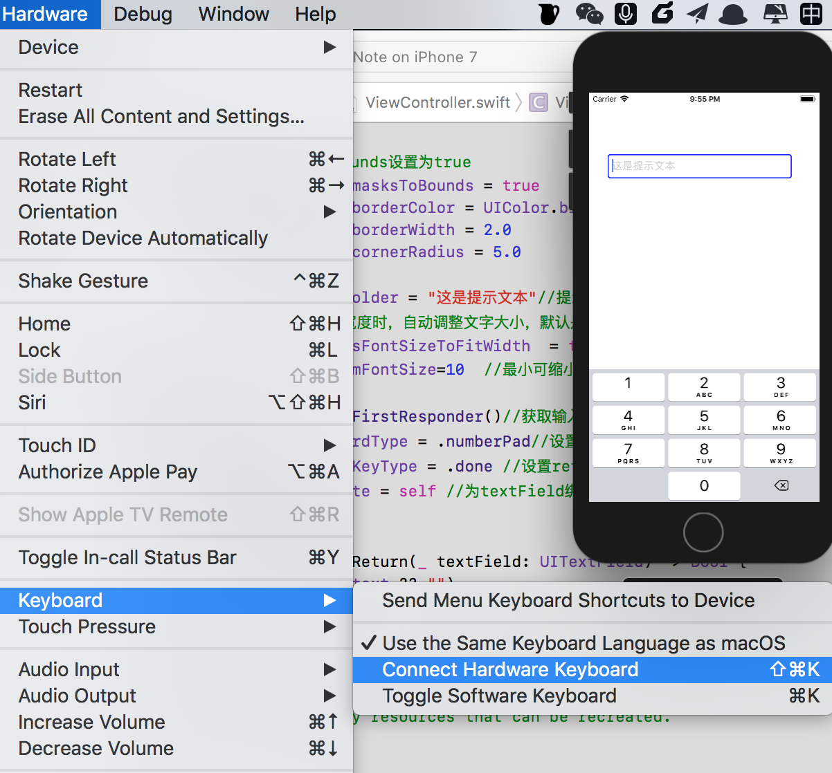 如果你在使用模拟器的时候发现键盘没有弹出来,可以通过下面的操作弹出键盘,Hardwar-->Keyboard-->取消Connect Hardware Keyboard的选中状态,或者你直接使用快捷键shift+command+k即可弹出键盘,