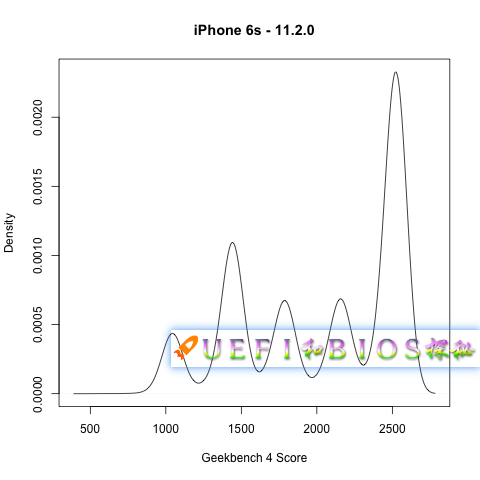 如何理解这两个图呢?其实很简单,这是个分布曲线图,他测试了很多iPhone 6s,发现在运行10.2.0时候,benchmark结果集中在2500分;而在运行11.2.0时,benchmark的结果分散在很多地方,中间有很多尖峰。有部分还在2500分,而也有很大部分集中在1500分,甚至1000分!性能下降了一半多!