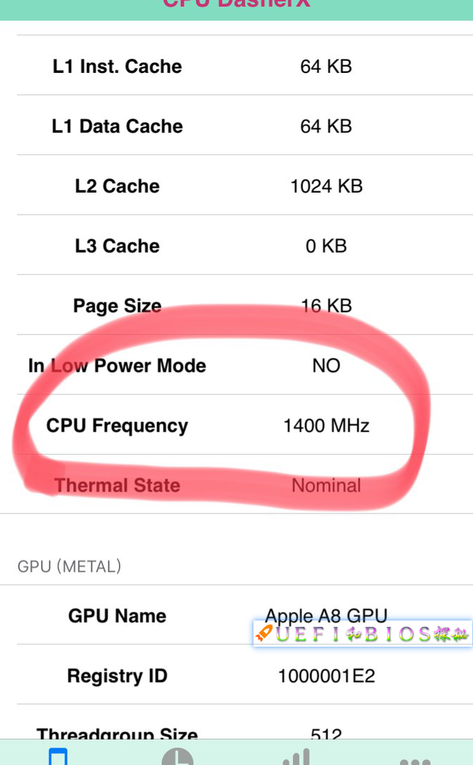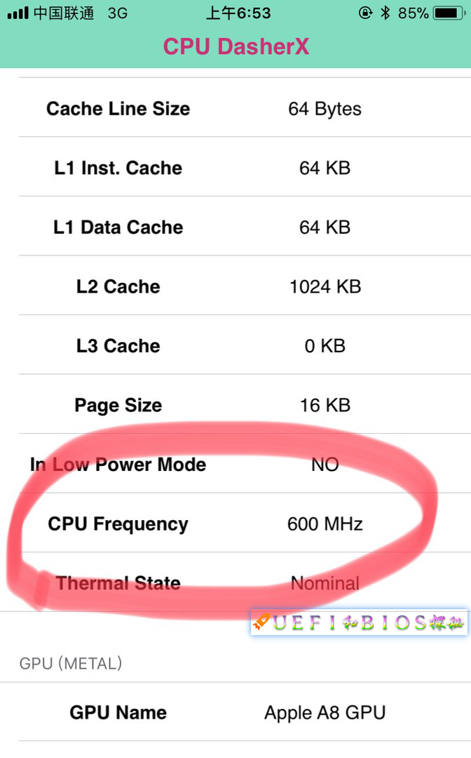 这说明从10.2.0到11.2.0升级之后,iphone 6s可能性能会下降,而且可能会大幅下降!那么到底为什么有的下降多,有的几乎不降低呢?原因在于电池,如果电池没有怎么消耗,则性能不变或下降不大,电池越老,性能下降越大。这个可以从一位叫做Sam的用户那里得到印证。他原来的iPhone手机很慢,他用DasherX测试发现手机频率最高600MHz:
