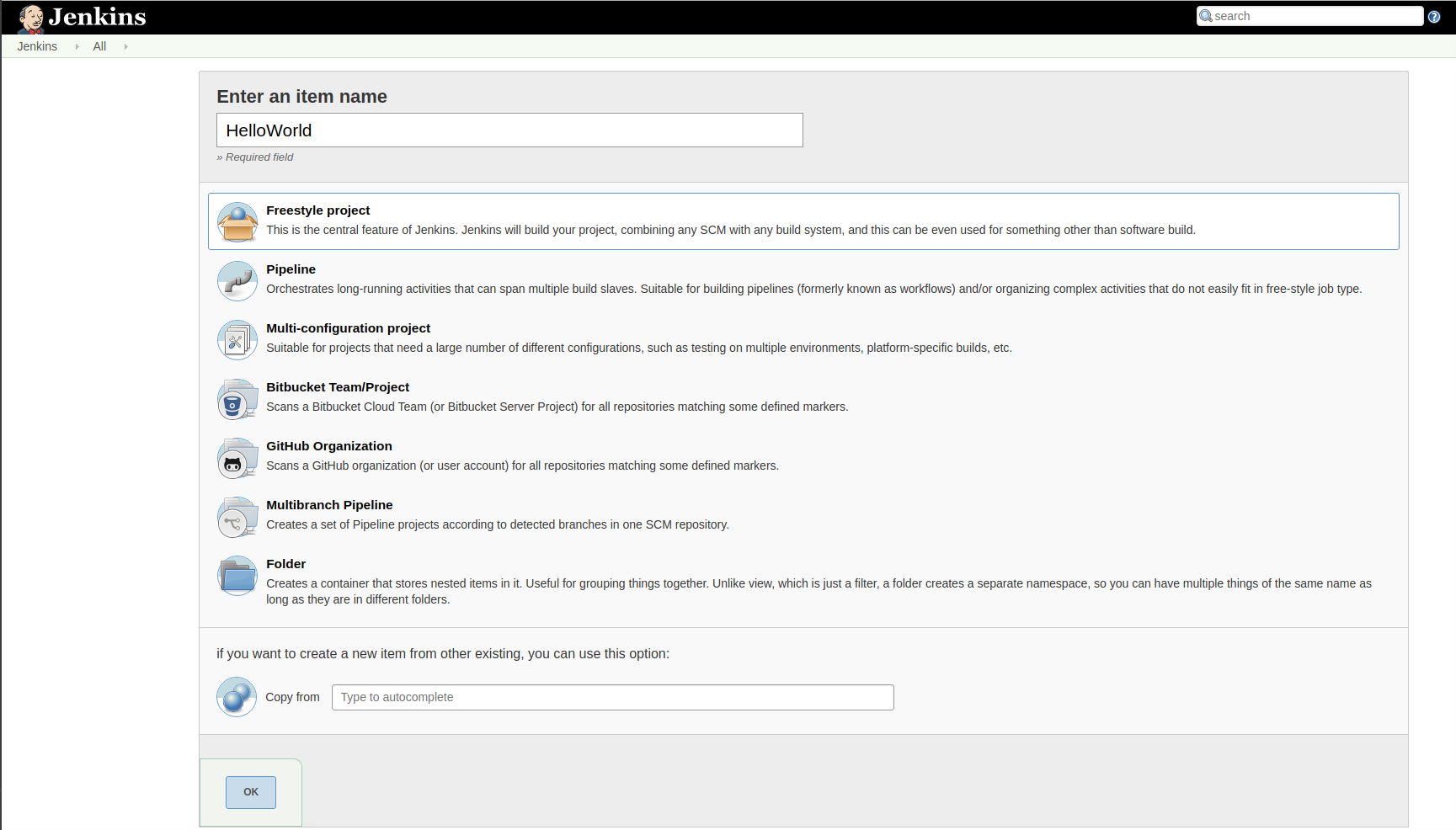 第2步- 为项目起名HelloWorld,单击选择Freestyle project,点击OK