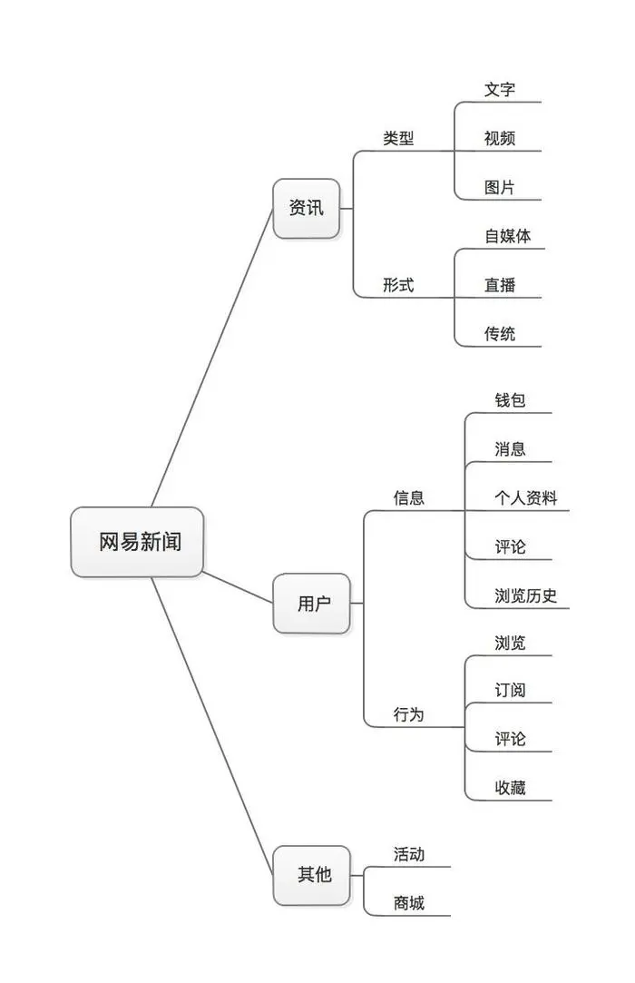 首要任务就是清楚自己需要实现什么,未来的业务方向又是怎么样的?对于新闻客户端来说,重点功能毋庸置疑就是提供用户阅读新闻的途径,了解或者关注一些前沿资讯。至于《网易新闻》未来会发展成怎么样我无从得知,也许会有内容变现的可能(毕竟最近又聊起来了这话题)。那么基于这些需求,可以从中提取一些关键词,如下面脑图所示: