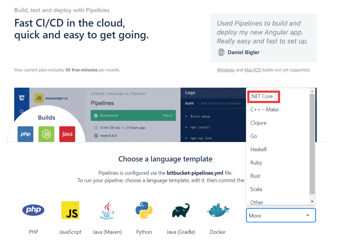 Bitbucket提供的Pipeline的免费构建时间为50mins/月,但对于我们简单尝鲜来说是足够了!当然如果不够用,其付费策略也很优惠,2$/月,拥有500mins/月的构建时间。 当然微软的VSTS,也是一个很好地选择。