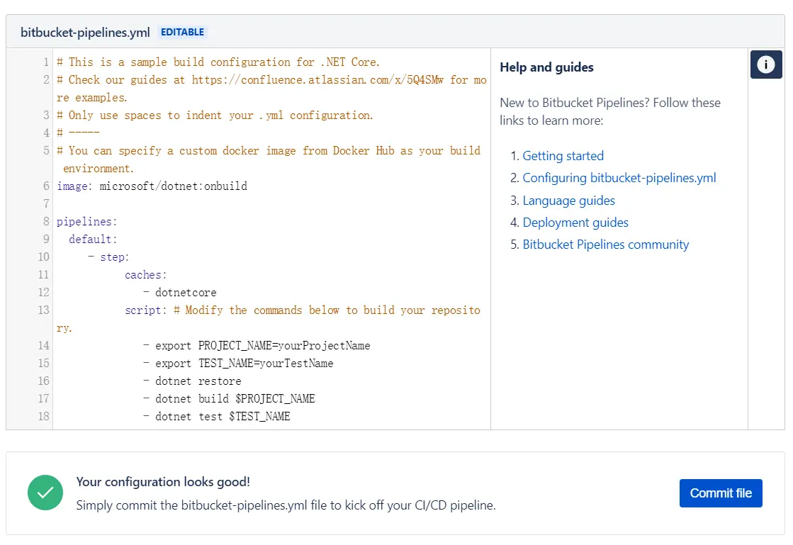 点击Pipeline,我们选择.NET Core,即可创建用于配置Pipeline的配置文件bitbucket-pipelines.yml。