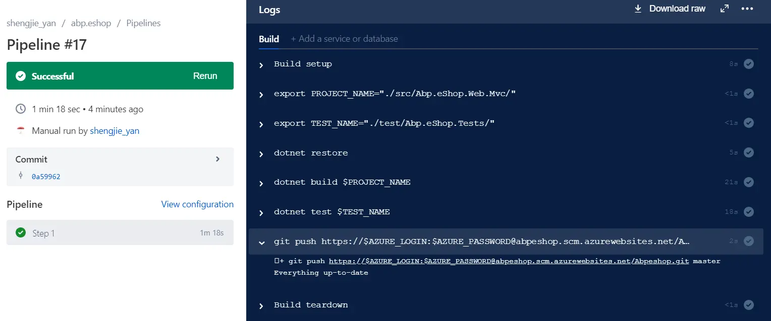 - git push https://$AZURE_LOGIN:$AZURE_PASSWORD@abpeshop.scm.azurewebsites.net/Abpeshop.git master