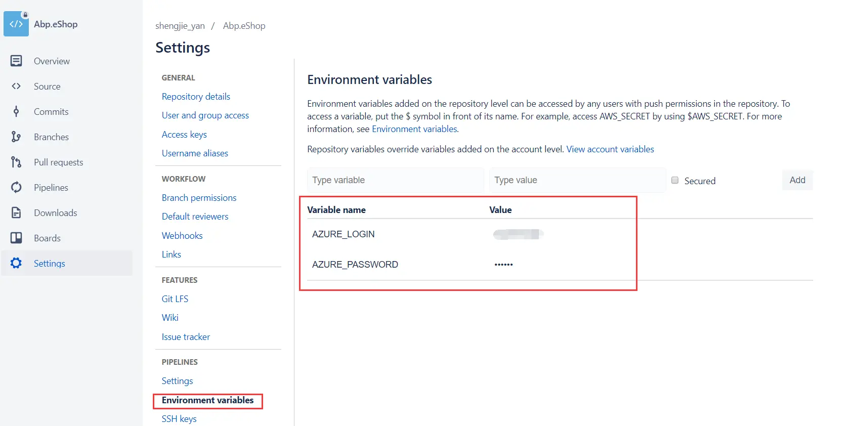 其中$AZURE_LOGIN和$AZURE_PASSWORD是Azure的部署凭据,我们需要在我们当前项目仓库中定义环境变量,如下图所示: