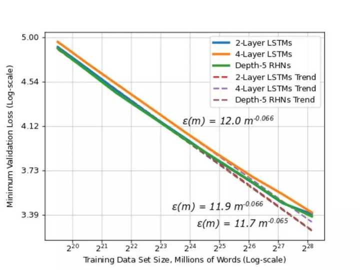 更具体地说,我们的研究结果表明,作为训练数据集大小的幂律,泛化误差的测量方法可以作为模型预测新样本的一个有效方法。之前的理论工作也表明,误差精度应该是幂律。然而,这些工作通常预示着一个“陡峭”的学习曲线——幂律指数应该是 -0.5——这表示模型应该学得很快。我们的经验收集学习曲线显示的是在 [-0.35,-0.07] 范围内小幅度的指数:实际的模型在学习实际数据时将比理论上慢的多。