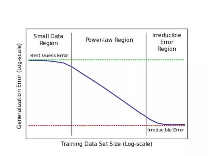 模型误差从“最佳猜测”开始,然后沿着幂律曲线下降到“不可约误差”。