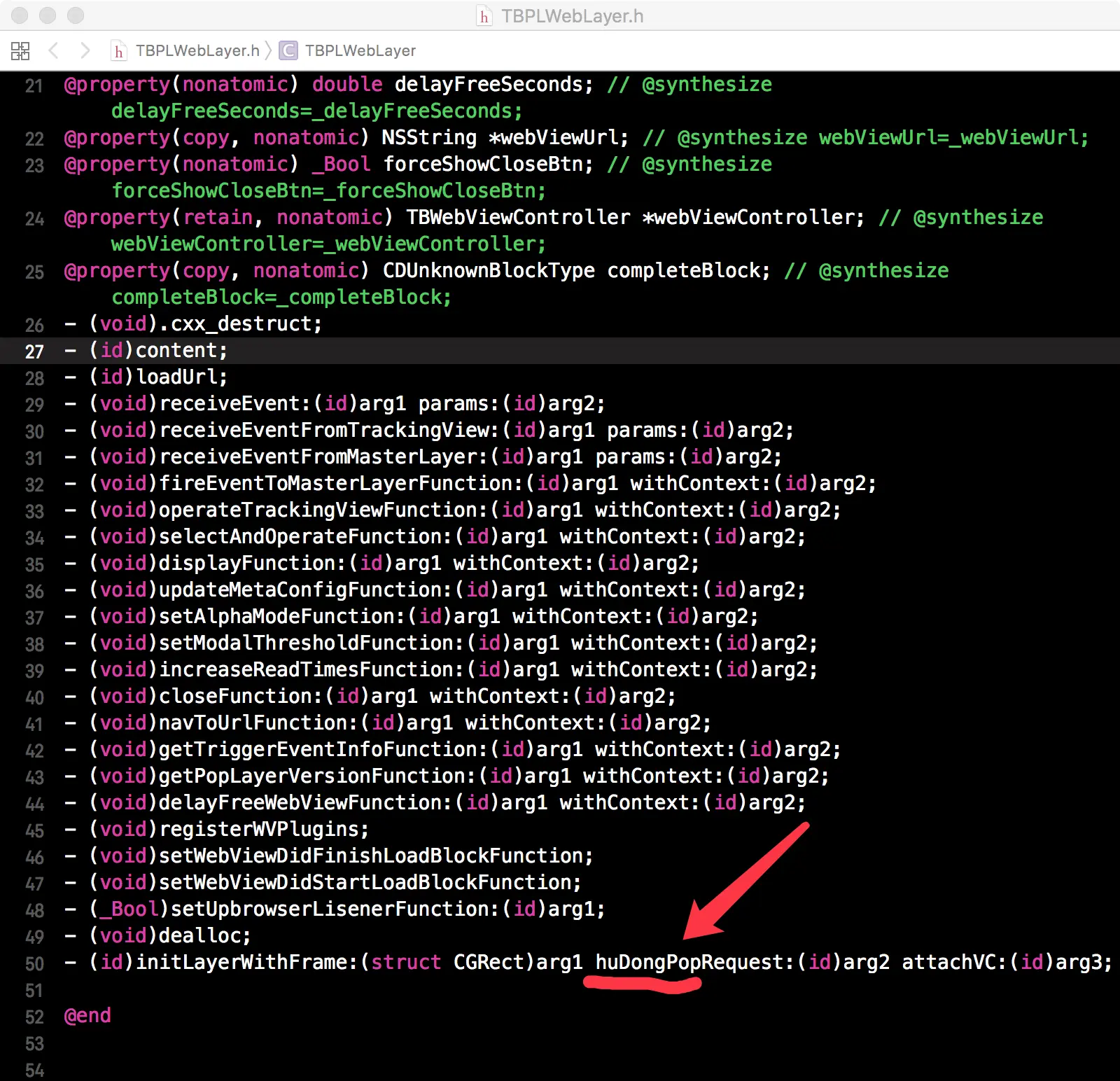我们观察到在这个类的初始化方法中有huDong这个拼音,于是我想应该和这个关键词有关。我们再看看它的父类TBPLBaseLayer,在它的父类里我又发现了这个关键词,如图: