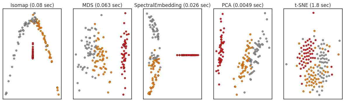 这些特征的两两组合,起来确实和花的种类有关。但实际上我们总共有四个维度,这里只能看见两个,我们能否将四个维度换成两个维度、展示在一个平面上呢?这里使用了多种非监督的降维方法,尝试去从非监督的角度,展示不同种类之间的区别:
