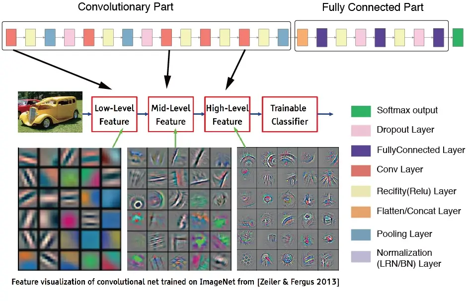 想让计算机帮忙挖掘、标注这些更多的特征,这就离不开 更优化的模型 了。事实上,这几年深度学习领域的新进展,就是以这个想法为基础产生的。我们可以使用更复杂的深度学习网络,在图片中挖出数以百万计的特征。在这些数以百万计的特征中,可能就包括了我们想到的形状、纹路、颜色等信息,更多的则是我们也无法理解、描述的东西。如下图,使用 Alexnet 深度学习架构,后面的全连接部分(Fully Connection Part)与本节 1.2 部分相同,都是三层隐藏层,但是前面却接了一个卷积部分(Convolutionary Part),用来在图像中提取各种特征。