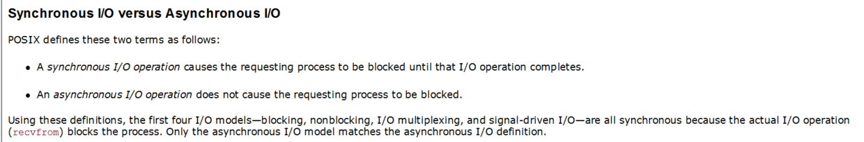 **结果表明:**前四个模型之间的主要区别是第一阶段,四个模型的第二阶段是一样的:过程受阻在调用recvfrom当数据从内核拷贝到用户缓冲区。然而,异步I/O处理两个阶段,与前四个不同。