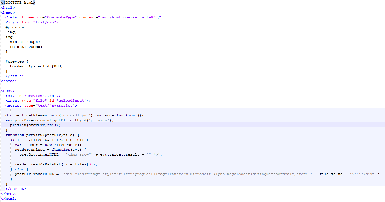 在上传图片是常常会遇到需要将选择的图片进行预览一下,方便用户看到上传的图片是什么样的,这样有助于用户在编辑其他资料时忘记了刚才上传的图片是什么。 在这里有两种解决办法,一种是在用户在选择文件时就将选择的文件进行上传,后台返回上传的图片的服务器地址,直接预览服务器地址的图片即可。这样做对用户的好处是非常的友好,在选择图片时就进行了上传,会是得用户在最终提交数据时的时间大量的缩短,将整体的上传时间分摊,达到一种很友好的上传体验。但这种方法对于服务器的压力过大,因为用户选择了图片,更替了图片都会进行上传。使得服务器会因此拿到太多的不必要的图片数据,造成服务器内存的臃肿;第二种方法就是在用户选择图片的时候只是预览本地的文件,在最后用户提交的时候将文件一并提交。这种方法对用户不友好有些不友好,但是却能提高用户操作的流畅性,在填完所有资料,一并上传。今天,我就来讲一讲第二中方法的实现。先贴上代码