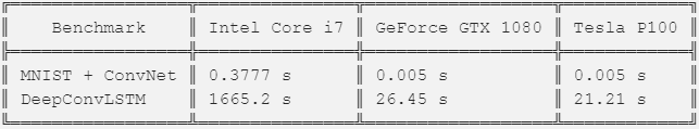 这样看不直观。有人专门做了对比[2],下图展示了训练的平均时间。Tesla在基准测试中胜过了GeForce;但是,只有1.25倍的加速(或者说,训练时间减少了20%)。在MNIST基准上看,差异并不明显,可能是由于epoch速度太快。