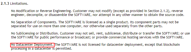 修改后的英伟达GeForce软件用户使用协议,No Datacenter Deployment,软件不能在数据中心使用。