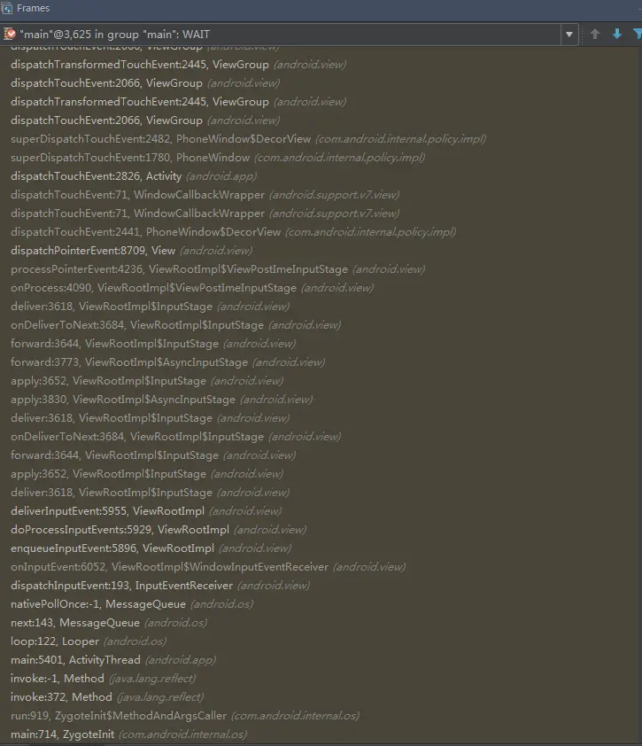 找到关于触摸事件的分发了,那么问题来了:这个事件分发是在何时调用的呢?我们知道View是一个基类,如果手机接收到触摸事件时肯定直接或间接调用的是基类的dispatchTouchEvent方法,所以需要查找下有那个类调用了dispatchTouchEvent方法。不查不知道,一查吓一跳,N多个类都有调用这个dispatchTouchEvent方法。定睛一看,原来都是View的子类(虚惊一场)。既然外面没有,那就找View当前有没有方法调用吧。别说,还真有一个——dispatchPointerEvent: