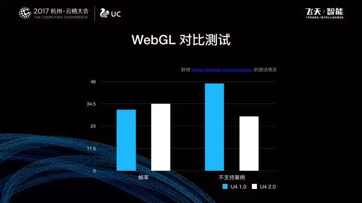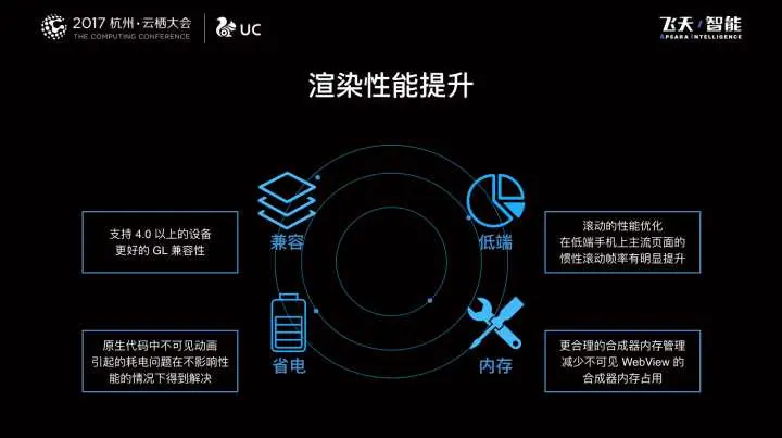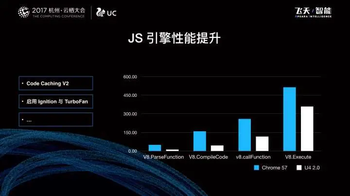 在今年杭州云栖大会上,我们的讲师嘉宾就提到过,我们在原有 Chromium 57 的基础上做了大量的优化,使得整体的性能有了很大的提升,简单来说,就是比 Chromium 57 还要快。JS 引擎整体得到提升,比如 code caching 以及启用 Ignition 与 TurboFan,还有其他的优化措施的加持,使得 U4 2.0 对比 57 版本有明显的提升。