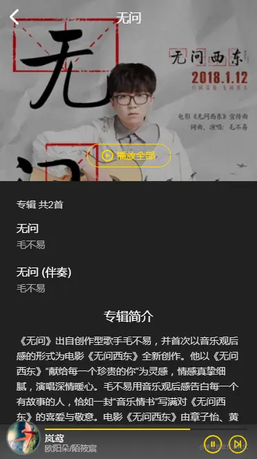 头部是一个很常见的标题加一个返回按钮(标准app的做法~~~),上部分是专辑背景图片,图片下面就是专辑的歌曲列表,最底下就是专辑的简介