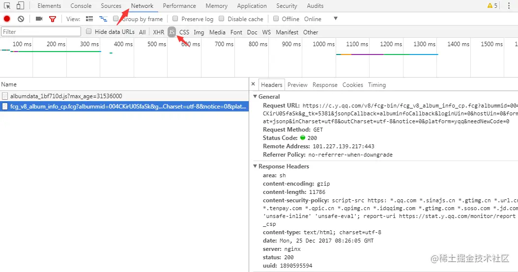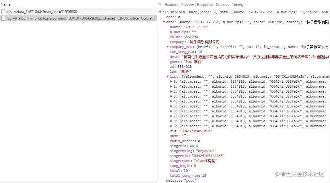 这个时候回弹出一个新的窗口,直接关闭它。回到刚才的开发者工具,可以看到有一个请求,这个请求就是获取专辑详情的