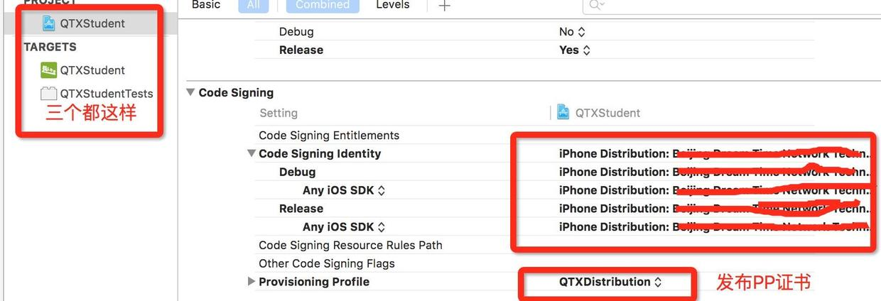- 新建发布证书ios_distribution.cer和描述文件Distribution.mobileprovision,准备好这两个文件后就到Xcode选取设置.