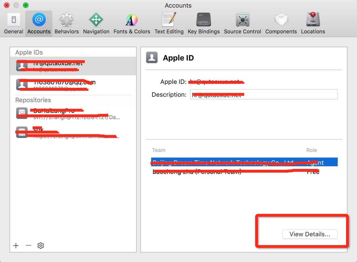 - 1、打开Xcode,配置项目环境,点击+可以选择Add Apple ID;点击View Details可以查看该Apple Id下的Certificates和Provisioning Profile证书文件,在这里你可以点击下载。在项目Targets下的Identity中,Team选择对应的Apple ID 即可。