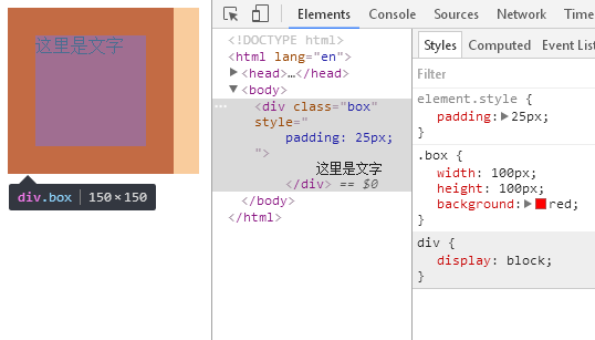 增加padding之后盒子变成了150*150