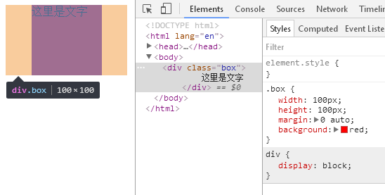 当盒子存在固定宽度的时候,可以使用margin:0 auto,进行居中。左右根据宽度自适应相同值(即居中),可以从图看出左右两边产生了相同的边距从而居中