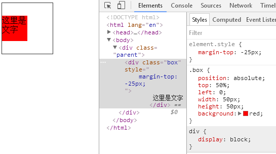 所以我们可以给往上自身的一半margin-top: -25px;(因为盒子 的高度是50px),这样就居中了。