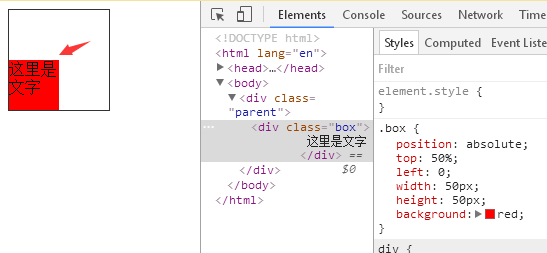 给子级加上定位,父级的话要用到position的属性除了static以外的属性。我们给top:50%;可以看出它其实已经在水平线上对齐了。只不过他是以水平线开始计算位置的距离。