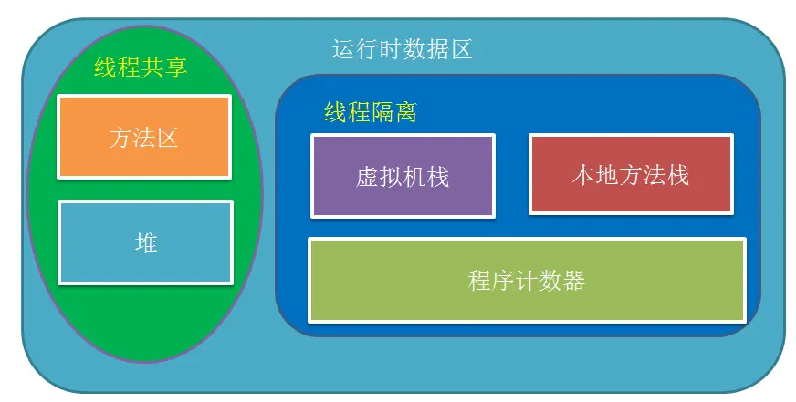Java内存区域分为大的两个区域,一部分是线程共享的,另一部分则是每个线程所独有的。刚开始了解编程时,大致就有印象,栈内存存在于方法体中,定义的那些变量什么的都是栈内存,方法结束就没了,堆内存则是使用new关键字申请出来的。当然这只是粗线的认识,下面一块块的说上图中的内存分布。