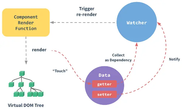 Vue遍历data对象上的所有属性,并通过原生Object.defineProperty()方法将这些属性转换为getter/setter(只支持IE9及以上浏览器)。Vue内部通过这些getter/setter追踪依赖,在属性被修改时触发相应变化,从而完成模型到视图的双向绑定。每个Vue组件实例化时,都会自动调用$watch()遍历自身的data属性,并将其记录为依赖项,当这些依赖项的setter被触发时会通知watcher重新计算新值,然后触发Vue组件的render()函数重新渲染组件。