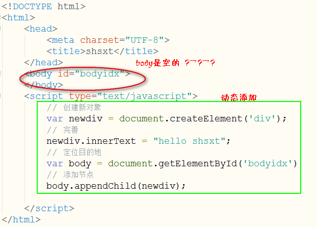 页面加载空白文档,动态给body添加一个div节点并配上文字