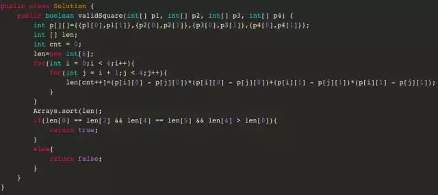 题目要求我们判断四个点能否组成正方形,那么正方形有哪些特征呢。我们容易想到,正方形四条边长度都相等,并且两条对角线长度也相等,所以,我们只要求出这四个点两两之间的距离,进行从小到大排序之后,如果这四个点能构成正方形,那么前面四个数就是四条边长的长度,后面两个数为两条对角线的长度,因此我们只需要判断前四个数以及后两个数它们是否相等即可。