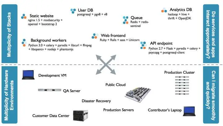 一方面应用包含多种服务,这些服务有自己所依赖的库和软件包;另一方面存在多种部署环境,服务在运行时可能需要动态迁移到不同的环境中。这就产生了一个问题: