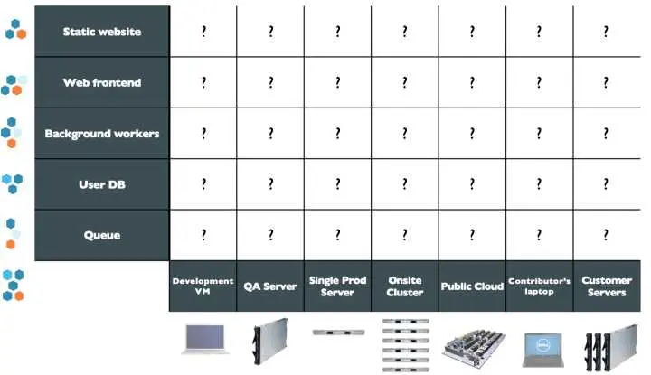 各种服务和环境通过排列组合产生了一个大矩阵。开发人员在编写代码时需要考虑不同的运行环境,运维人员则需要为不同的服务和平台配置环境。对他们双方来说,这都是一项困难而艰巨的任务。