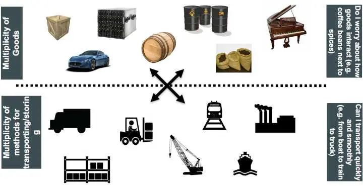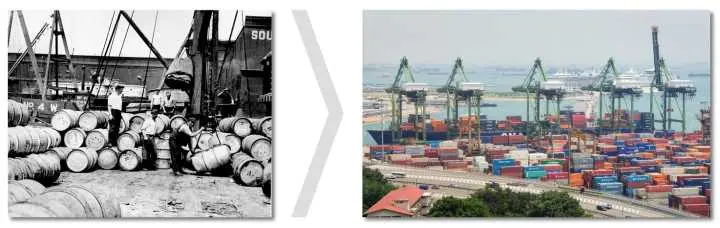 任何货物,无论钢琴还是保时捷,都被放到各自的集装箱中。集装箱在整个运输过程中都是密封的,只有到达最终目的地才被打开。标准集装箱可以被高效地装卸、重叠和长途运输。现代化的起重机可以自动在卡车、轮船和火车之间移动集装箱。集装箱被誉为运输业与世界贸易最重要的发明。