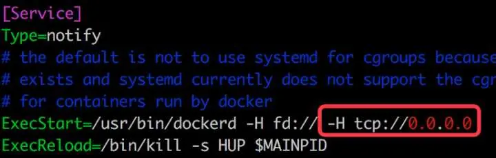 1.编辑配置文件 /etc/systemd/system/multi-user.target.wants/docker.service,在环境变量 ExecStart 后面添加 -H tcp://0.0.0.0,允许来自任意 IP 的客户端连接。