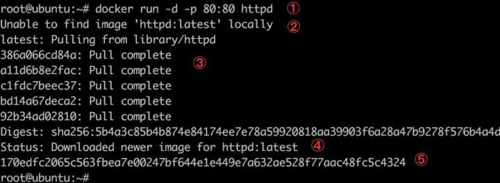 docker run命令。 - Docker daemon 发现本地没有 httpd 镜像。