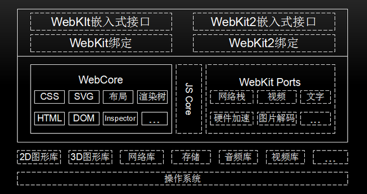 - 第三方库,为了WebKit提供支持,如图形库、网络库、视频库等。