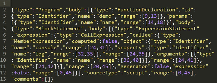 源代码-→抽象语法树-→字节码-→JIT-→本地代码(V8引擎没有中间字节码)。一段代码的抽象语法树示例如下: