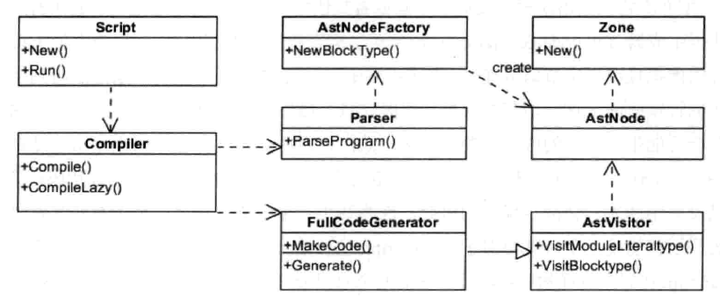 - Compiler:编译器类,辅组Script类来编译生成代码,调用解释器(Parser)来生成AST和全代码生成器,将AST转变为本地代码;