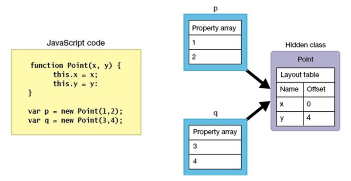 使用Point构造了两个对象p和q,这两个对象具有相同的属性名,V8将它们归为同一个组,也就是隐藏类,这些属性在隐藏类中有相同的偏移值,p和q共享这一信息,进行属性访问时,只需根据隐藏类的偏移值即可。由于JavaScript是动态类型语言,在执行时可以更改变量的类型,如果上述代码执行之后,执行q.z=2,那么p和q将不再被认为是一个组,q将是一个新的隐藏类。