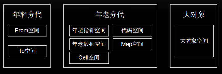 - 堆:管理JavaScript使用的数据、生成的代码、哈希表等。为方便实现垃圾回收,堆被分为三个部分:
