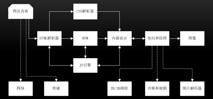 首先是网页内容,输入到HTML解析器,HTML解析器解析,然后构建DOM树,在这期间如果遇到JavaScript代码则交给JavaScript引擎处理;如果来自CSS解析器的样式信息,构建一个内部绘图模型。该模型由布局模块计算模型内部各个元素的位置和大小信息,最后由绘图模块完成从该模型到图像的绘制。在网页渲染的过程中,大致可分为下面3个阶段。