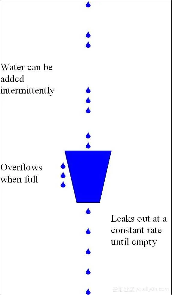 - 来不及流出的水存在水桶中(缓冲),以固定速率流出;