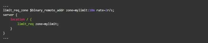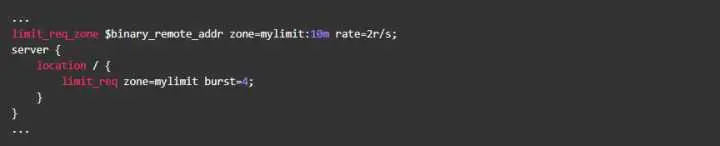按请求速率限速是指限制单个IP(或者其他的key)发送请求的速率,超出指定速率后,Nginx将直接拒绝更多的请求。采用leaky bucket算法实现。为深入了解这个模块,我们先从实验现象说起。开始之前我们先简单介绍一下该模块的配置方式,以下面的配置为例: