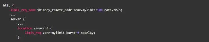使用limit_req_zone关键字,我们定义了一个名为mylimit大小为10MB的共享内存区域(zone),用来存放限速相关的统计信息,限速的key值为二进制的IP地址($binary_remote_addr),限速上限(rate)为2r/s;接着我们使用limit_req关键字将上述规则作用到/search/上。burst和nodelay的作用稍后解释。