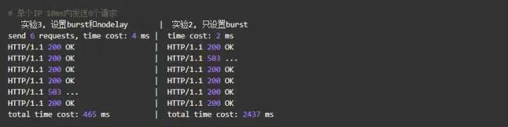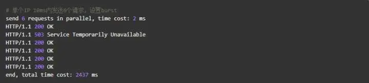 我们加入了burst=4,意思是每个key(此处是每个IP)最多允许4个突发请求的到来。如果单个IP在10ms内发送6个请求,结果会怎样呢?