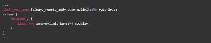 但是请注意:burst的作用是让多余的请求可以先放到队列里,慢慢处理。如果不加nodelay参数,队列里的请求不会立即处理,而是按照rate设置的速度,以毫秒级精确的速度慢慢处理。