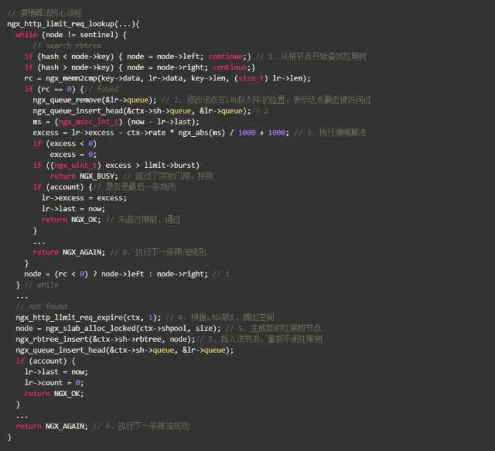 漏桶算法的实现也比我们想象的简单,其核心是这一行公式excess = lr->excess - ctx->rate * ngx_abs(ms) / 1000 + 1000,这样代码的意思是:excess表示当前key上遗留的请求数,本次遗留的请求数 = 上次遗留的请求数 - 预设速率 X 过去的时间 + 1。这个1表示当前这个请求,由于Nginx内部表示将单位缩小了1000倍,所以1个请求要转换成1000。